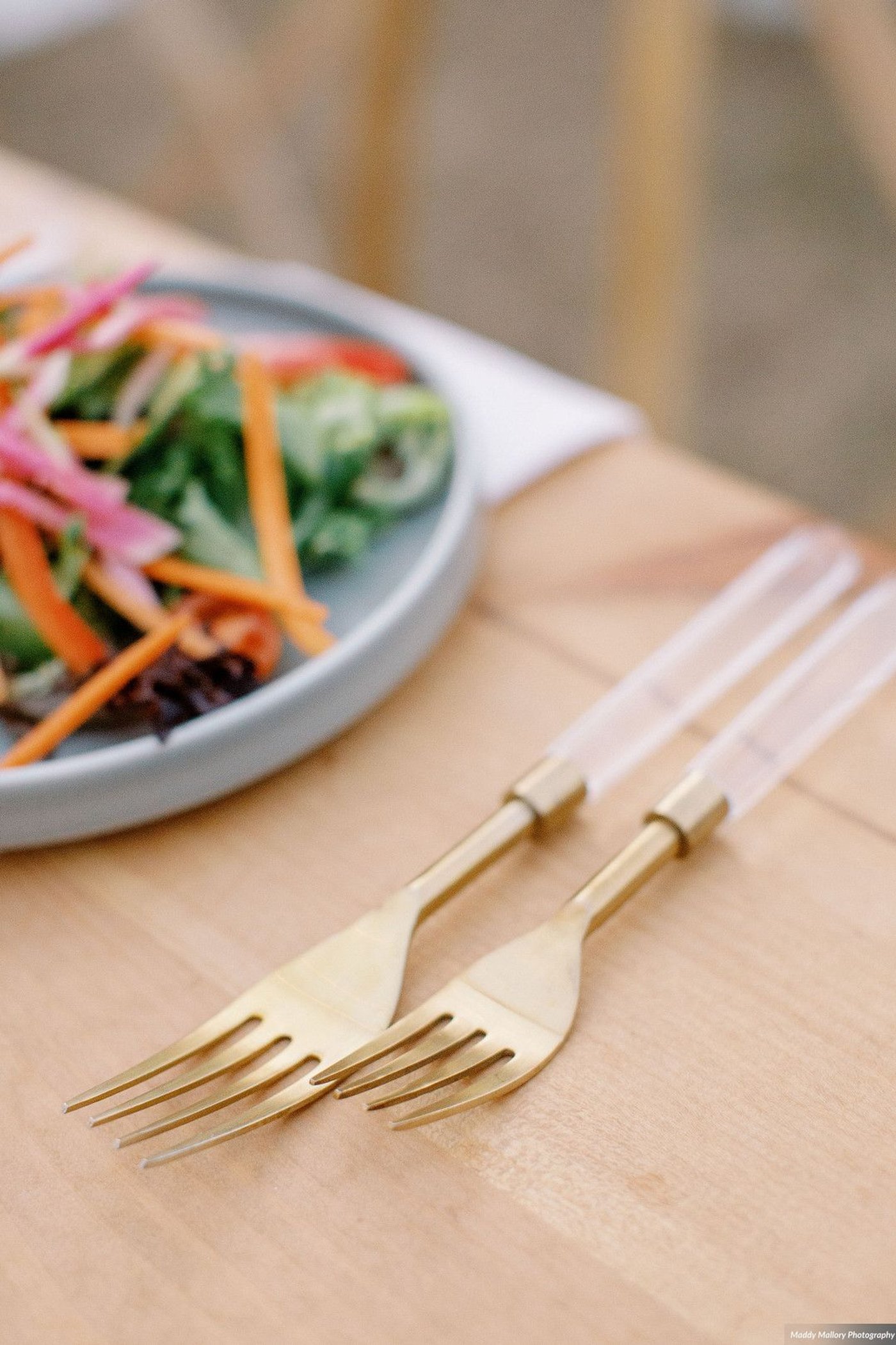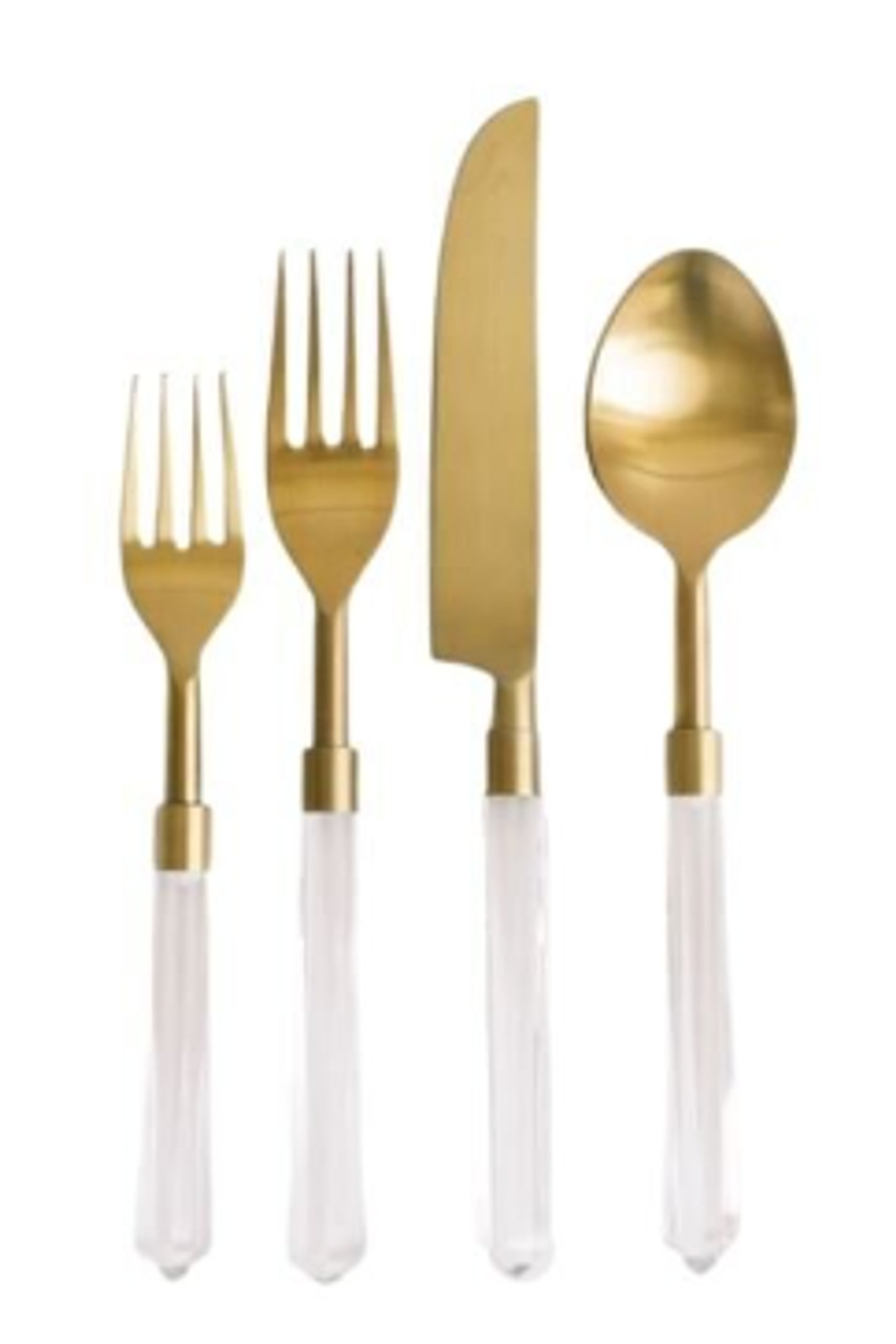 Description: Matte gold flatware with a Lucite handle. Modern, fun & full of personality.