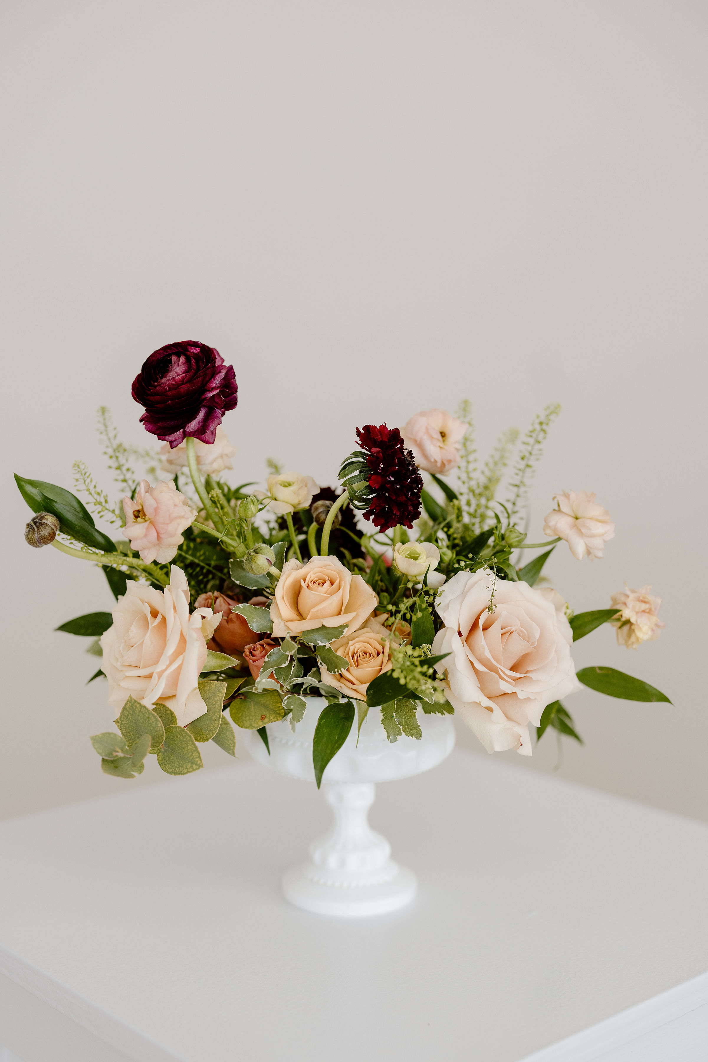 Description: ur Aria floral collection features lush, garden style arrangements in a vibrant plum and neutral color palette.