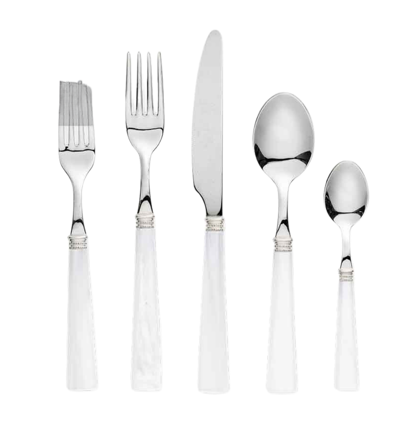 Description: Our Elsa Flatware Set is pretty in pearl! An elegant white pearl handle matched with a shiny silver finish on top, Elsa is lovely with a variety of place settings.
