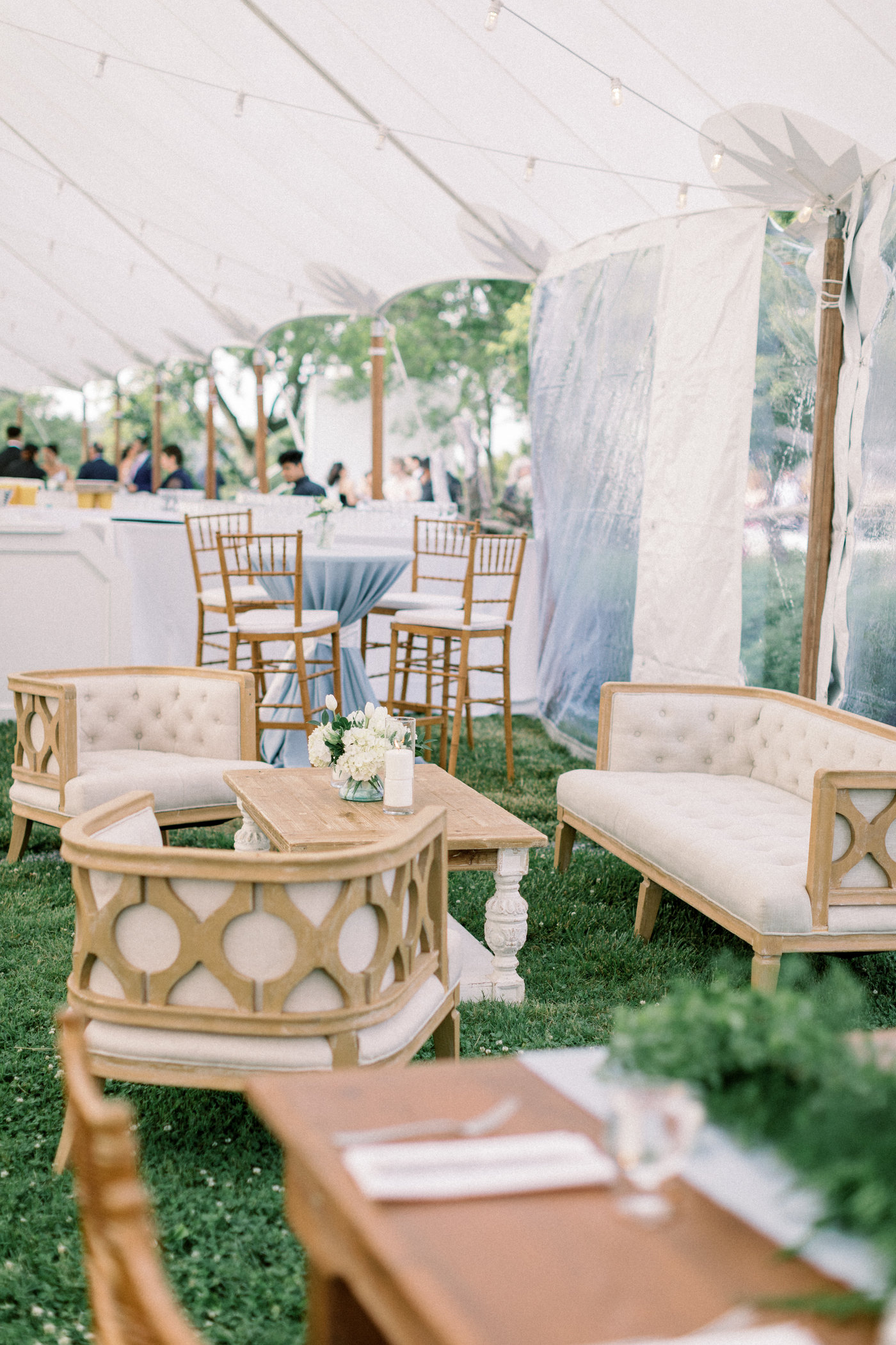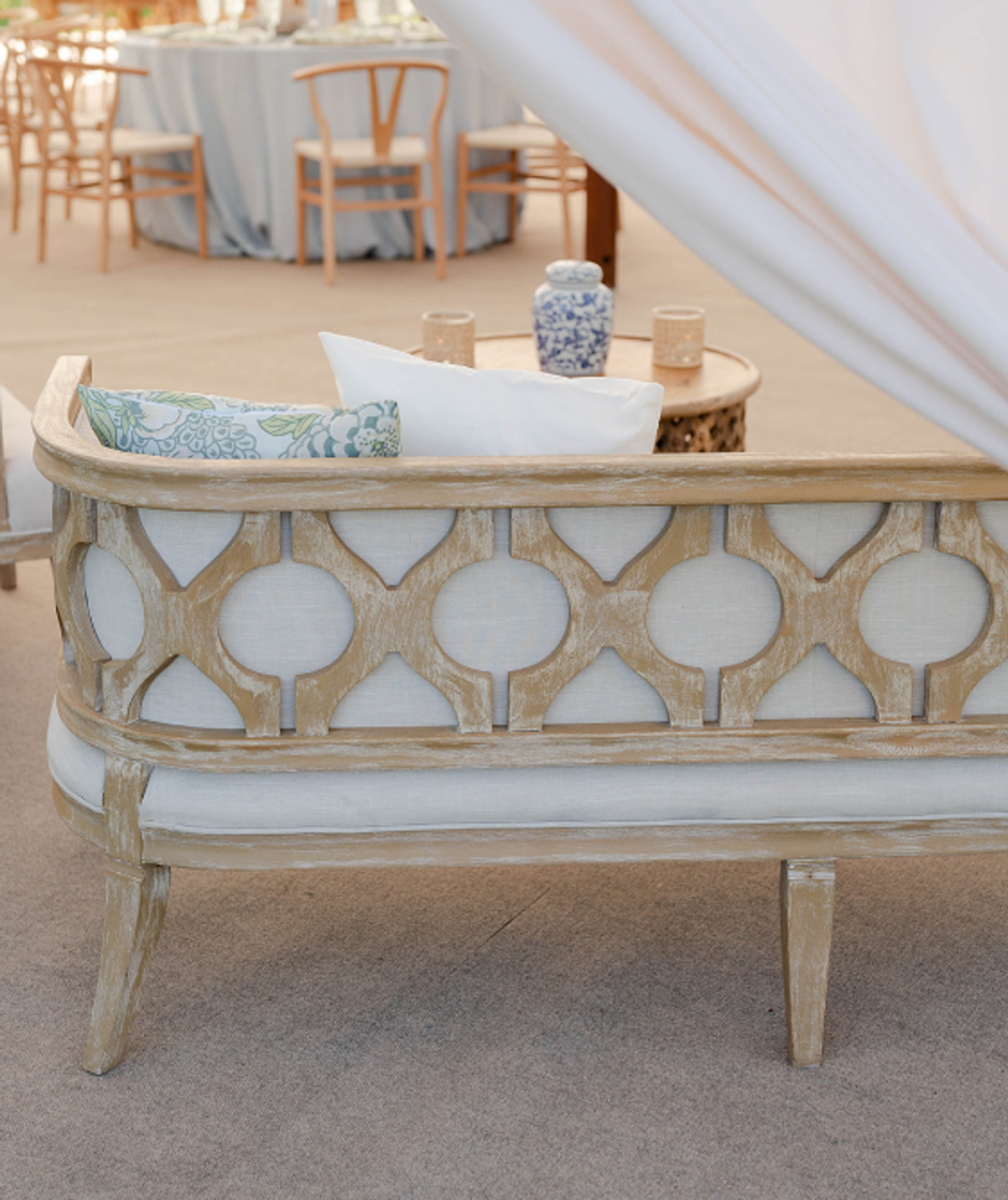 Description: This beautiful linen tufted sofa features elaborate decorative wooden trim across the back and sides. Pair with The Lola chairs to complete the lounge set!