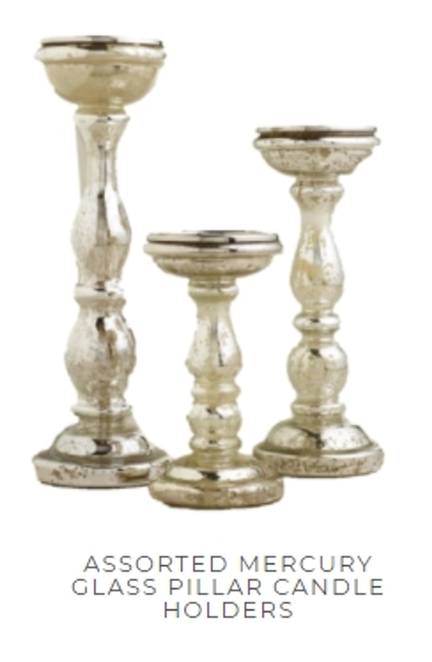 Description: Gorgeous mercury glass candle holders in a variety of heights and styles. Adds the perfect amount of elegance to your tabletop. The perfect compliment to our mercury glass candlesticks and votives.