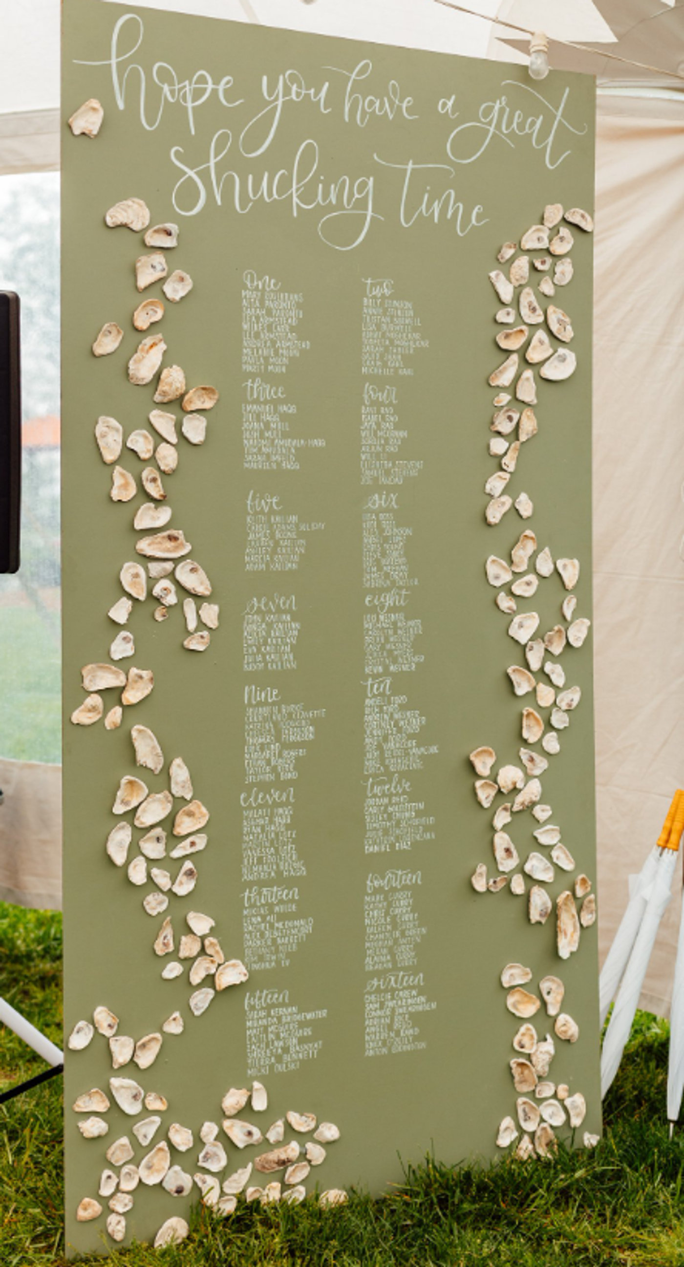 Description: "Hope you have a great shucking time!" This seating chart is perfect for the coastal event of your dreams! Made with real shells, we can personalize this backdrop to feature the names of all of your guests.